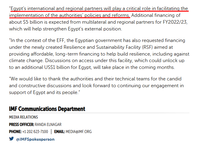 وأن هؤلاء "الشركاء الدوليون والإقليميون" سيقدمون لمصر "تمويلا إضافيا بحوالي 5 مليارات دولار خلال العام المالي 2022/23، مما سيساعد على تعزيز موقف مصر الخارجي".(من المصدر)