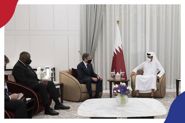 لأول مرة فى دولة عربية يجتمع وزير الخارجية والدفاع الأمريكى مع رئيسها يحملان شكر الرئيس الأمريكى، هذا ما حدث فى سبتمبر/أيلول، عندما أوفد بايدن وزيراه بلينكن وأوستن إلى الدوحة، لشكر دولة قطر وأميرها على الدور الفاعل فى المفاوضات الأمريكية مع طالبان، ودور قطر فى عمليات الإجلاء من أفغانستان، بينما توافد عدد من وزراء خارجية الإتحاد الأوروبى إلى الدوحة لنفس الغرض، ولتنسيق إجلاء رعاياهم مع قطر.